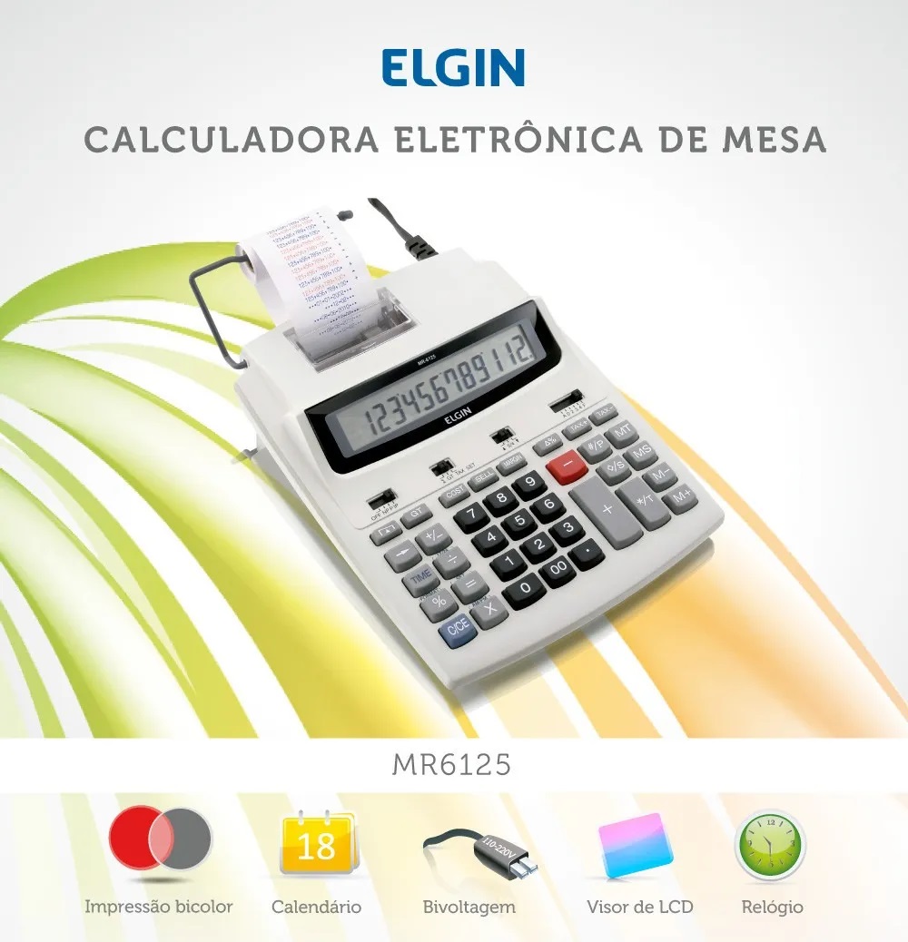 A Calculadora de Mesa Elgin MR6125 é ideal para ambientes corporativos, contábeis e comerciais que exigem rapidez e precisão. Com visor LCD de 12 dígitos, impressão bicolor e funções avançadas como contador de itens, seletor de casas decimais, memórias e cálculo de taxas, ela oferece total controle e agilidade no dia a dia. Seu design robusto e alimentação bivolt com chave garante durabilidade e praticidade no uso contínuo.