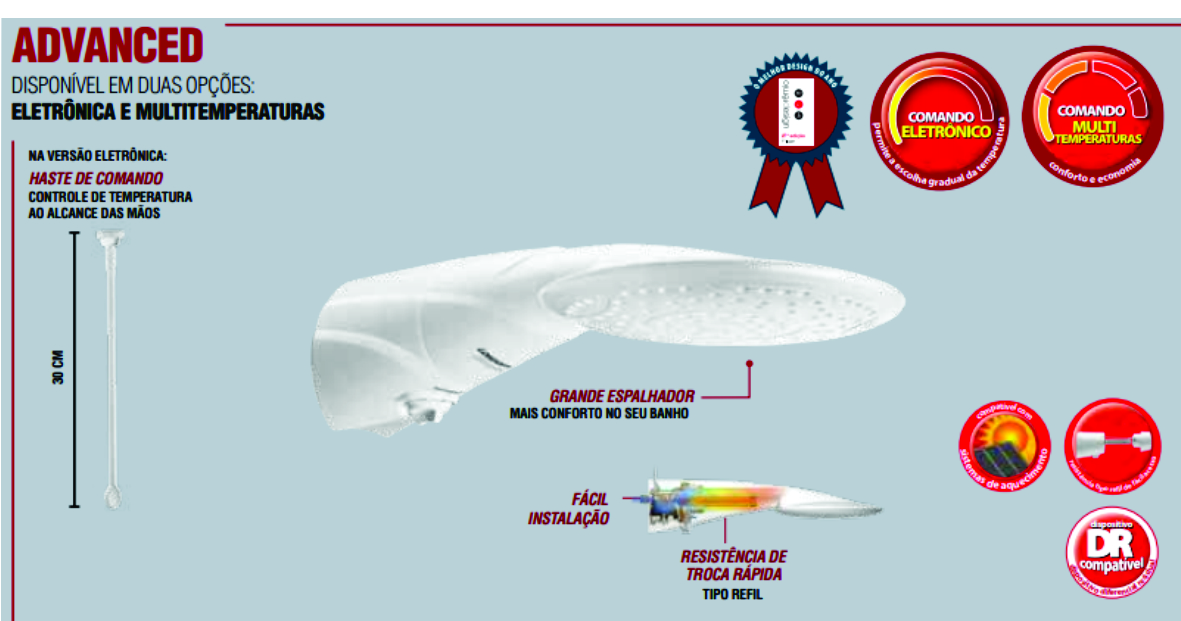 A Ducha Advanced Eletrônica da Lorenzetti oferece a combinação perfeita entre conforto, tecnologia e design moderno. Com comando eletrônico, permite ajuste gradual e preciso da temperatura da água, ideal para todas as estações do ano. Seu espalhador de grande proporção garante um banho com ótimo volume de água, enquanto a haste prolongadora proporciona praticidade ao permitir a troca de temperatura ao alcance das mãos. Desenvolvida com cano incorporado e design sem fiação aparente, a ducha conta com resistência tipo refil de fácil substituição e é compatível com aquecedores solares, oferecendo versatilidade e eficiência no uso diário.
