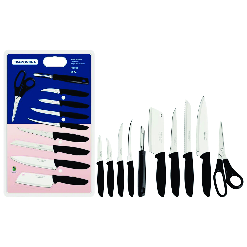 Sua cozinha ganhará maior funcionalidade e versatilidade com o jogo de facas Tramontina Plenus com lâminas em aço inox e cabos de polipropileno preto 10 peças. Com peças essencias para o preparo das suas refeições do dia a dia, como facas, cutelo, descascador e tesoura, ele vai deixar o preparo de suas receitas ainda mais fácil. As lâminas das peças são produzidas em aço inox com tratamento térmico e cabos de polipropileno, garantem alto poder de corte, resistência e maior durabilidade. Um jogo que ainda pode ser levado à máquina de louças e que vai facilitar suas tarefas, seja na hora de cozinhar ou limpar!
