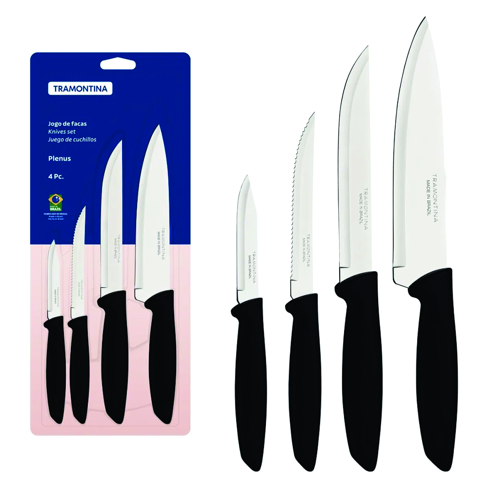 O jogo de facas Tramontina Plenus com lâminas em aço inox e cabos de polipropileno preto 04 peças será seu ajudante perfeito na hora de preparar suas refeições, sejam elas com carnes, legumes ou frutas. Perfeito para uso diário, ele é composto por facas desenvolvidas com lâminas em aço inox com tratamento térmico e devido a isso, garantem um excelente fio de corte. Os cabos são em polipropileno na cor preta, são resistentes e duráveis, podendo ainda, ir à máquina de lavar louças. Escolha Tramontina e deixe seu dia a dia na cozinha muito mais prático!
