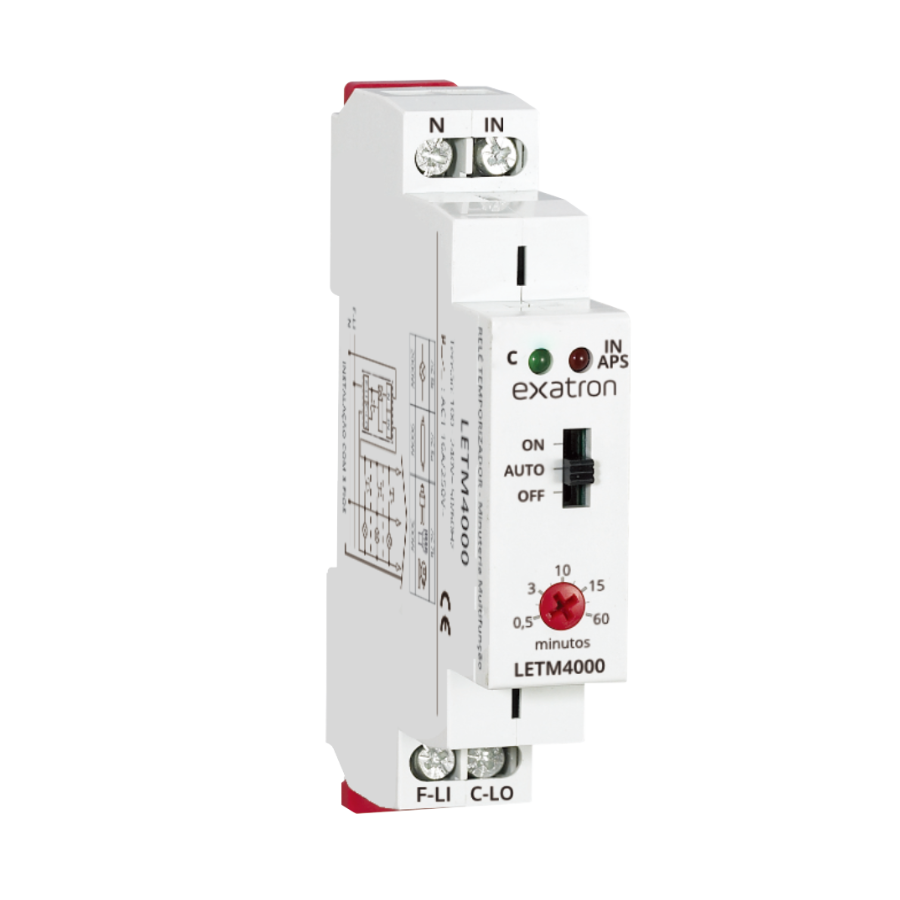 O Relé Temporizador Multifunção Exatron LETM4000 foi desenvolvido para automação temporizada de sistemas de iluminação e pequenos motores, oferecendo eficiência, segurança e praticidade em aplicações como halls, escadarias, corredores, exaustores e banheiros. Com ajuste de tempo de 30 segundos até 60 minutos, o dispositivo garante versatilidade em diversos ambientes. Equipado com sistema APS de autoproteção, LEDs indicativos, compatibilidade com pulsadores neon (EZNEON) e função AUTO-ON-OFF, é ideal para instalações em quadros elétricos com fixação em trilho DIN. Um produto confiável, produzido com material antichama e indicado para aplicações que exigem repetição e segurança.
